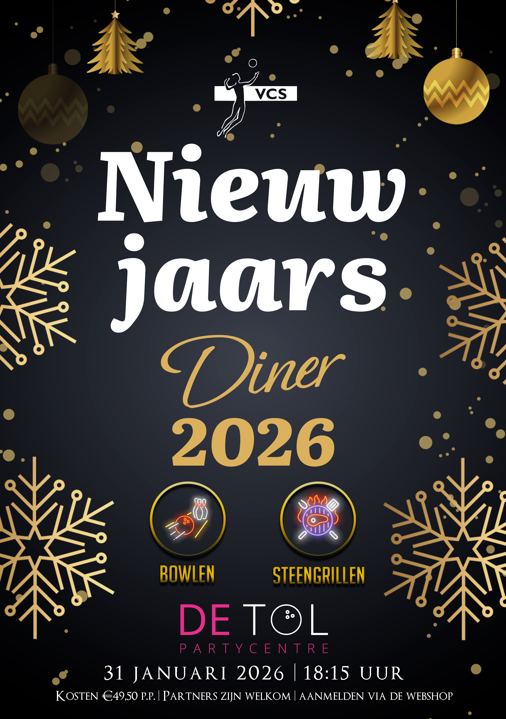 Op zaterdag 31 januari 2026 luiden we als VCS gezamenlijk het nieuwe jaar in met een Nieuwjaarsdiner bij Partycentre De Tol. We starten de avond met een sportief en ontspannen uurtje bowlen. Aansluitend verplaatsen we ons naar de steengrill. Gedurende twee uur geniet je onbeperkt van diverse soorten vlees (kip, rund en varken), groenten, versgebakken friet, verschillende sauzen, een uitgebreide saladebar en natuurlijk stokbrood met huisgemaakte kruidenboter. Tijdens zowel het bowlen als het steengrillen zijn alle drankjes (pils, frisdranken, wijn en warme dranken) volledig inbegrepen.